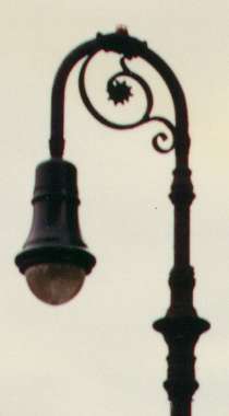 | I shot this old bishop on Worth St., between Chatham and Foley Squares, around 1992. It had been spared the ignimony of having to wear a bucket light, shifting into the sodium era with a shiny new bell fixture, normally reserved for new retro-bishops. Note the photocell switch that has been implanted on the top of the bishop's head. My previous visit to this pole, in 1982, found it precariously clinging to life, with a bare incandescent bulb dangling from a wire. |