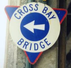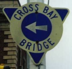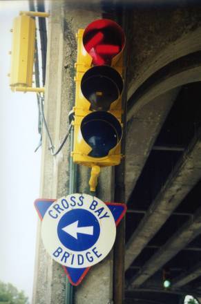 | One of the hardest signs to come by, of all the unique NYC bridge and tunnel directionals, are those pointing towards the Cross Bay Bridge spanning Jamaica Bay between the Rockaways and Cross Channel Island. There were at least three variants, of which I nabbed two. I missed shooting the third, oldest and rarest of the three by thinking that the one on top, without the red border, was the same. In actuality, the third variant has white letters against a blue background. Oh well, better luck next time. Taken 7/2000. |